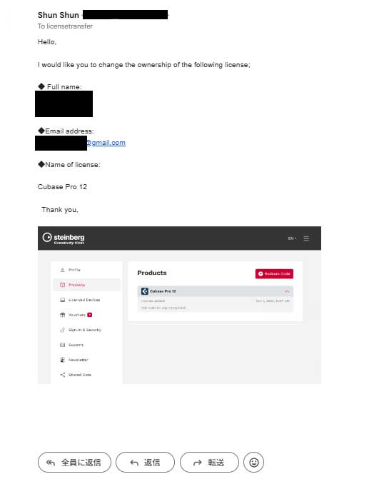 Steinbergマイページに登録している名前とメールアドレス、譲渡したいアプリケーションを記入して送信しましょう。