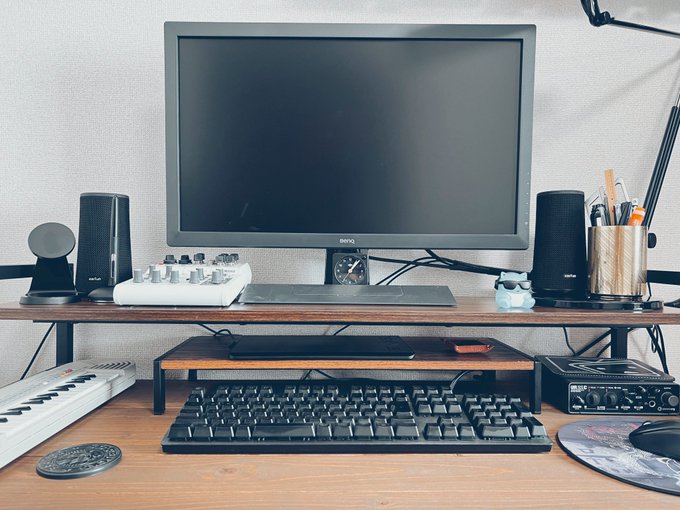 モニター台も同じようなヴィンテージ風のものを探してきたのでかなりぴったり。