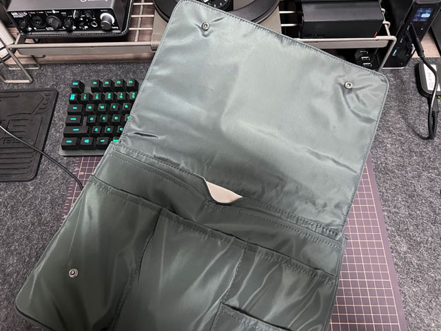 外出時の周辺機器をいれるポケットが別れていて、大げさでないサイズのもの。取っ手など要らん物がついていると、バッグの中で邪魔になります。