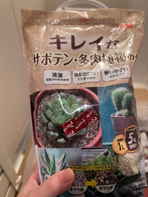 うちの多肉植物はこの「キレイなサボテン多肉の土 1L 5号鉢向け DCM」で育成しています。