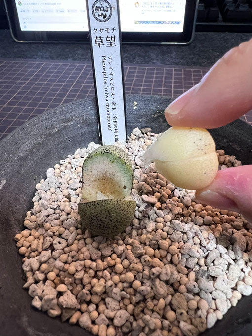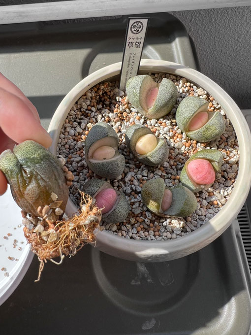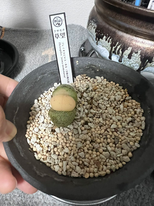 | 由来 | 和菓子のような見た目ですが、やがて脱皮を繰り返しピンク色の部分は緑色に塗り替えられ、ただの帝玉になることでしょう。葉緑素のないピンク葉でどれだけ生きられるのか。望みをかけて「餅」ではなく「望」の字をつけました。 |