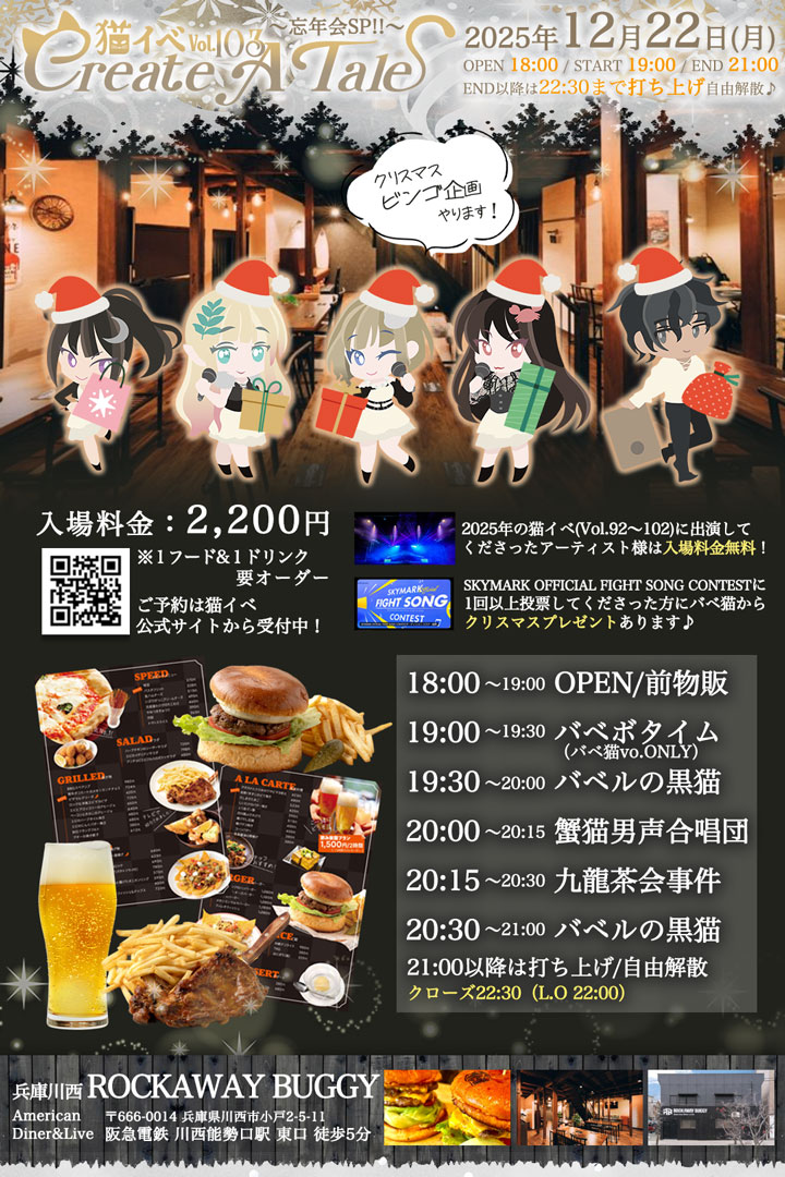 DesignMusicWorkフライヤー制作ライブ情報 イベントフライヤーバベルの黒猫兵庫川西ROCKWAY BUGGY猫イベ猫衣林薙 Create A Tale(猫イベ) vol.103 X Bluesky Facebook コピー 2025.11.25 ■日程:2025年12月22日(月)■入場料:各2,200円(別途+1ドリンク・1フード) ご来場予約はこちら ■会場ROCKWAY BUGGYhttps://rockawaybuggy.com/〒666-0014 兵庫県川西市小戸2丁目5−11