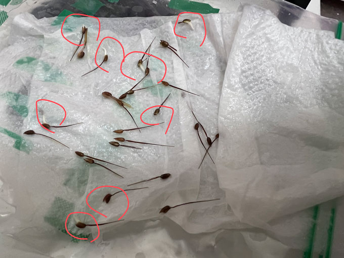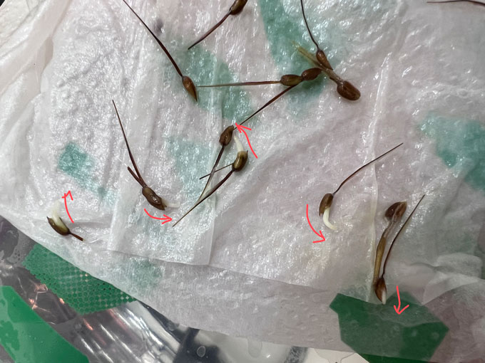 キッチンペーパーにそのままメネデール水を含ませ、種を並べます。30個。
