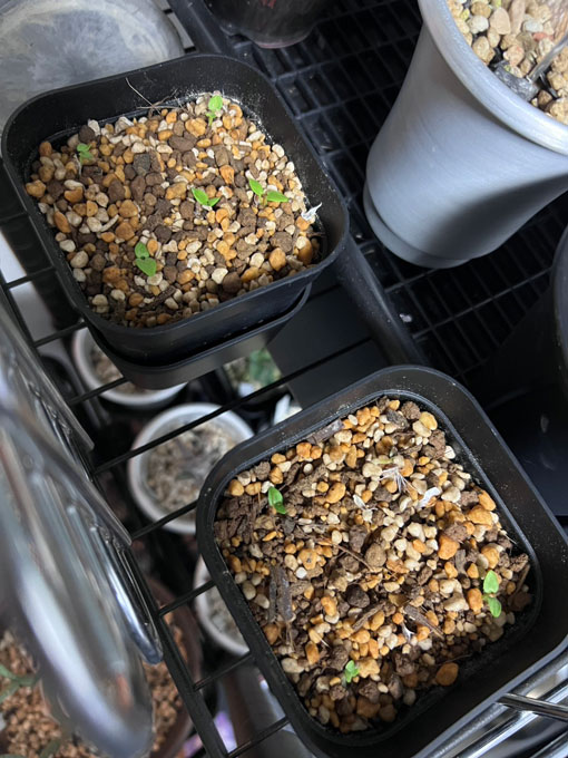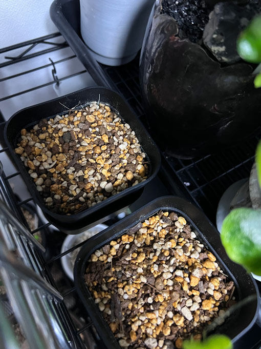 上に少し土をかけ、腰水で十分給水して、灌木棚のLEDライト木漏れ日くらいのところに置きました。用土は、ねこチップSSを少々混ぜたプロトリーフのプレミアム土。