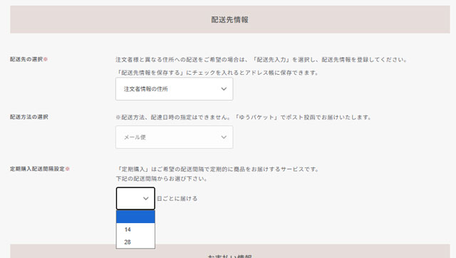 配送間隔は「隔週1回(14日毎)」と「月1回(28日毎)」から選べます。