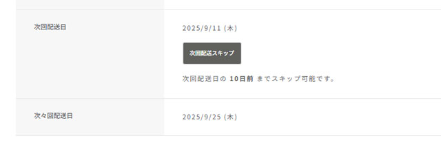 次回配送スキップは、「定期購入情報詳細」画面を下っていくとボタンができます。